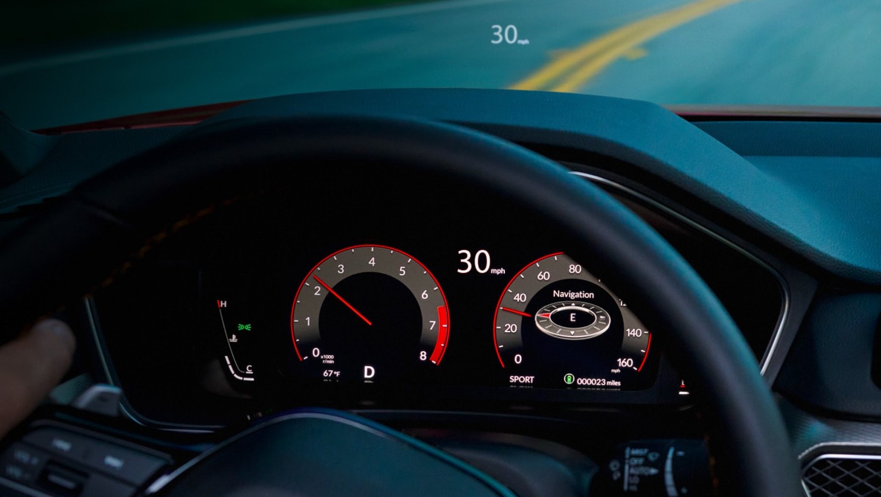 La pantalla a la altura de la vista disponible, diseñada para mantenerte centrado en el manejo, proyecta información importante, como la velocidad, alertas de asistencia al conductor AcuraWatch y mucho más, en el parabrisas.